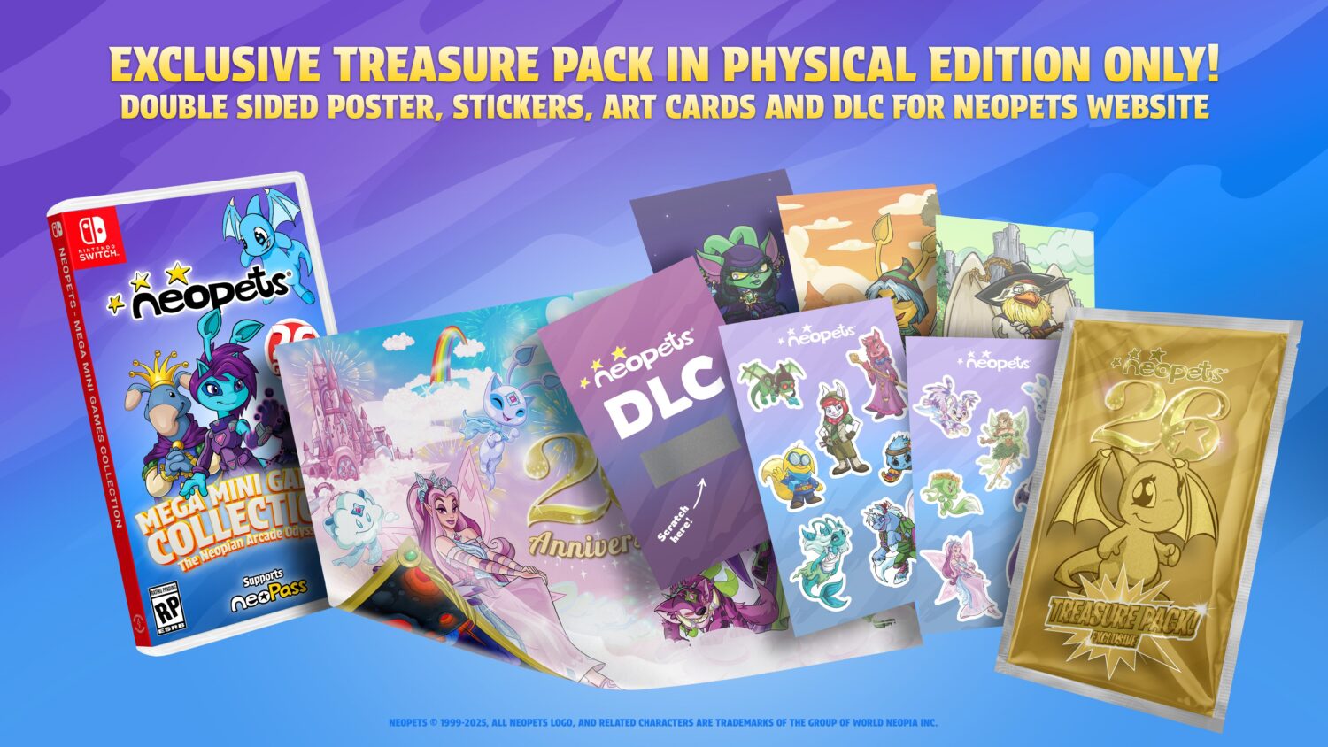 The title is a collection of 25 classic Neopets browser games, with an additonal new 26th game and a secret 27th game. It can be played as a standalone title, as well as connected to a Neopets account for special rewards there. The game is planned to release on March 26th 2026. There will also be a physical “Treasure Pack” available, including the following:
