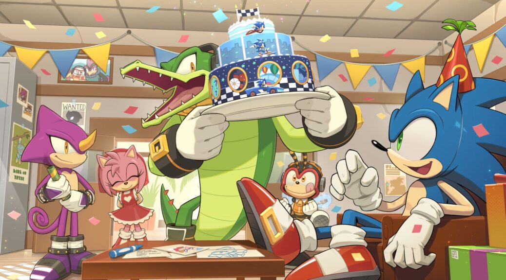 The artwork features Amy Rose and Team Chaotix gifting a cake to the blue blur, decorated with a racing theme to tie-in to the upcoming Sonic Racing: CrossWorlds.