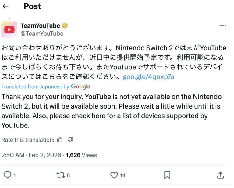 Now, a few months later, Youtube has once again brought up a dedicated app for Switch 2. In a now deleted response on Twitter, Team Youtube said it would be available on Switch 2 “soon”, but did not provide any further details.